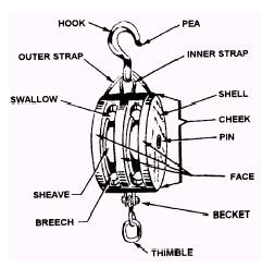 Figure 13-44.-Parts of a tackle. To "round in" means to bring the blocks of a tackle toward each other, usually without a load on the tackle (opposite of overhaul). The block(s) in a tackle assembly change(s) the direction of pull, provide(s) mechanical advantage, or both. The name and location of the key parts of a fiber line block, as shown in figure 13-42, are as follows: l The frame (or shell), made of wood or metal, houses the sheaves. . The sheave is around, grooved wheel over which the line runs. Usually the blocks will have one, two, three, or four sheaves. Some blocks will have up to eleven sheaves. . The cheeks are the solid sides of the frame or shell. . The pin is a metal axle that the sheave turns on. It runs from cheek to cheek through the middle of the sheave. . The becket is a metal loop, formed at one or both ends of a block; the standing part of the line is fastened to the becket. l The straps hold the block together and support the pin on which the sheaves rotate. . The shallow is the opening in the block through which the line passes. . The breech is the part of the block opposite the swallow. Blocks are constructed for use with fiber line or wire rope. Wire rope blocks are heavily constructed and have large sheaves with deep grooves. Fiber line blocks are generally not as heavily constructed as wire rope blocks and have smaller sheaves with shallow, wide grooves. A large sheave is needed with wire rope to prevent sharp bending. Because fiber line is more flexible and pliable, it does not require sheaves as large as that required for wire rope of the same size. Blocks, fitted with one, two, three, or four sheaves, are often referred to as single, double, triple, and quadruple blocks. Blocks are fitted with a number of attachments, such as hooks, shackles, eyes, and rings. Figure 13-45 shows two metal framed, heavy-duty blocks. Block A is designed for manila line, and block B is for wire rope. |