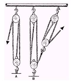 Figure 13-43.-A. Simple tackle; B. Compound tackle. inserted in the strap of the block. A tackle (fig. 13-43) is an assembly of blocks and lines used to gain a mechanical advantage in lifting and pulling. In a tackle assembly, the line is reeved over the sheaves of blocks. The two types of tackle systems are simple and compound. A simple tackle system is an assembly of blocks in which a single line is used (fig. 13-43, view A). A compound tackle system is an assembly of blocks in which more than one line is used (fig. 13-43, view B). Various terms used with a tackle, as shown in figure 13-44, are as follows: . The fall is either a wire rope or a fiber line reeved through a pair of blocks to form a tackle. l The hauling part of the fall leads from the block upon which the power is exerted. The standing part is the end which is attached to a becket. . The movable (or running) block of a tackle is the block attached to a fixed objector support. When a tackle is being used, the movable block moves and the fixed block remains stationary. l "Two blocked" means that both blocks of a tackle are as close together as they will go. You may also hear this term called block and block. . To "overhaul" means to lengthen a tackle by pulling the two blocks apart.