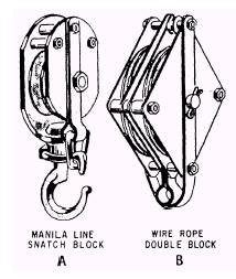 Block to Line Ratio The size of a fiber line block is designated by the length in inches of the shell or cheek. The size of a standard wire rope block is controlled by the diameter of the rope. With nonstandard and special-purpose wire rope blocks, the size is found by measuring the diameter of one of its sheaves in inches. Use care in selecting the proper size line or wire for the block to be used. If a fiber line is reeved onto a tackle whose sheaves are below a certain minimum diameter, the line becomes distorted that causes unnecessary wear. A wire rope too large for a sheave tends to be pinched that damages the sheave. Also, the wire will be damaged because of too short a radius of bend. A wire rope too small for a sheave lacks the necessary bearing surface,