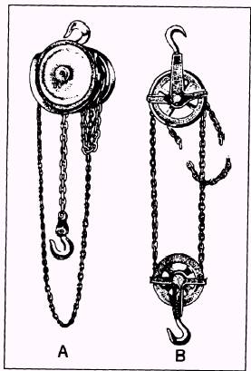 Figure 13-45.-Heavy-duty blocks. puts the strain on only a few strands, and shortens the life of the wire. With fiber line, the length of the block used should be about three times the circumference of the line. However, an inch or so either way does not matter too much; for example, a 3-inch line maybe reeved onto an 8-inch block with no ill effects. As a rule, you are more likely to know the block size than the sheave diameter. However, the sheave diameter should be about twice the size of the circumference of the line used. Wire rope manufacturers issue tables that give the proper sheave diameters used with the various types and sizes of wire rope they manufacture. In the absence of these, a rough rule of thumb is that the sheave diameter should be about 20 times the diameter of the wire. Remember with wire rope, it is the diameter, rather than circumference, and this rule refers to the diameter of the sheave, rather than to the size of the block, as with line. Block Safety Safety items when using block and tackle are as follows: l Always stress safety when hoisting and moving heavy objects around personnel with block and tackle. . Always check the condition of blocks and sheaves before using them on a job to make sure they are in safe working order. See that the blocks are properly greased. Also, make sure that the line and sheave are the right size for the job. . Remember that sheaves or drums which have become worn, chipped, or corrugated must not be used, because they will injure the line. Always find out whether you have enough mechanical advantage in the amount of blocks to make the load as easy to handle as possible. . You must NOT use wire rope in sheaves and blocks designed for fiber line. They are not strong enough for that type of service, and the wire rope will not properly fit the sheaves grooves. Likewise, sheaves and blocks built for wire rope should NEVER be used for fiber line. CHAIN HOISTS Chain hoists provide a convenient and efficient method for hoisting by hand under particular circumstances. The chief advantages of chain hoists are that the load can remain stationary without requiring attention and that the hoist can be operated by one man to raise loads weighing several tons. The slow lifting travel of a chain hoist permits small movements, accurate adjustment of height, and gentle handling of loads. A ratchet handle pull hoist is used for short, horizontal pulls on heavy objects. Chain hoists differ widely in their mechanical advantage, depending upon their rated capacity. Three general types of chain hoists for vertical operation are the spur gear hoist, the differential chain hoist, and the screw gear hoist. The spur gear hoist (fig. 13-46, view A) is the most satisfactory for ordinary operations. This type of hoist is about 85 percent efficient. The differential chain hoist (fig. 13-46, view B) is only about 35 percent efficient and is satisfactory for occasional use and light loads. The screw gear hoist is about 50 percent efficient and is satisfactory where less frequent use of the hoist is required. Chain hoists arc usually stamped with their load capacities on the shell of the upper block. Chain hoists