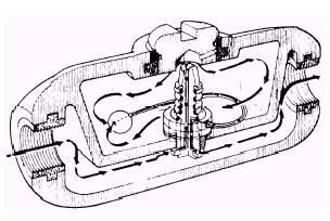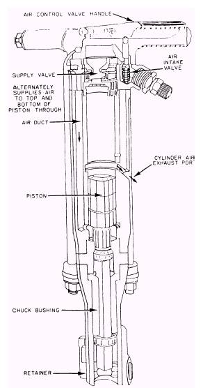 Figure 14-12.-In-line oiler. When checking out a tool, you should determine if the tool needs an in-line oiler. If an in-line oiler (fig. 14- 12) is needed to provide lubrication to the tool, follow the tool manufacturer's recommendation for the correct lubrication. PAVEMENT BREAKER/ JACKHAMMER The pavement breaker resembles a portable rotary rock drill/jackhammer. The pavement breaker consist of a piston that is moving in a chamber under air pressure and weighs between 30 to 90 pounds. The major working parts of a pavement breaker are shown in figure 14-13. Notice no rotational mechanism is provided and no variation in speed is possible. This is the major difference between the pavement breaker and rotary rock drill/jackhammer. Pavement breaker attachments (fig. 14-14) are the moil point, the chisel point, the asphalt cutter, and the clay spade.