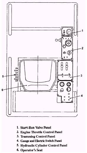 Figure 14-22.-Operator's control console. The pedestal is free to rotate in the boom base clevis, and the boom is free to swing up and down in the pedestal; for example, the assembly is a universal joint that permits the boom to be swung from side to side or raised and lowered. A clevis, welded to the bottom side of the boom tube, supports the piston end of the lift cylinder, and a clevis, welded to the right side of the boom tube, supports the piston end of the swing cylinder. DUMP AND SWING ASSEMBLY The hydraulically powered dump and swing assembly is used to support and position the drill guide. The assembly permits 180-degree drill guide dump and 90-degree drill guide swing. GUIDE SWING AND EXTENSION MOUNTING The hydraulically powered guide extension assembly extends the drill guide for additional coverage or places the drill guide foot piece firmly against the ground for additional stability. DRILL MOUNTING The drill mounting consists of the drill guide, drill mounting plate, centralizer/foot piece, feed chain, feed motor assembly, and hose reel plate. Drill Guide The upper end of the guide is fitted with a hydraulic feed motor. A combination centralizer/foot piece is bolted to the lower end of the drill guide. Drill Mounting Plate The drill is mounted on a drill mounting plate that is clamped to and travels on the drill guide with the aid of four roller bearings. Feed Chain The drill guide is fitted with a heavy-duty roller chain for the drill mounting plate. The chain passes over a sprocket on the lower end of the guide and a drive sprocket in the feed motor on the upper end of the guide. The chain has two chain joints at both ends, connected at the bottom of the mounting plate with a link joint. Feed Motor Assembly The hydraulically powered feed motor assembly, which incorporates a planetary gear drive unit, is bolted at the upper end of the drill guide. A brake valve is installed in the hydraulic circuit just before the hydraulic feed motor. The brake valve absorbs the shock when the hydraulic feed motor receives a shock load and prevents spontaneous dropping of the drill. The feed motor feeds the drill through the feed chain and drill mounting plate up and down the drill guide. The feed motor is capable of exerting a maximum pull up of 4,410 pounds. Hose Reel Plate All the hoses for the drill are connected by way of the hose reel to the hose holder, which is attached to the right medium part of the drill guide. |