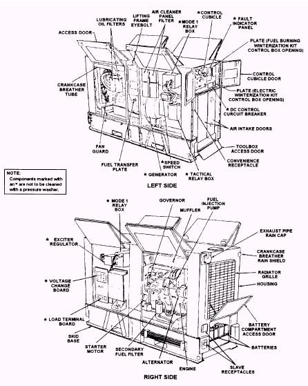 Figure 14-31.-Components of a generator. Uses To grease fittings, pull out the length of hose you need, wipe the fitting clean, and push the coupler of the control valve onto the fitting. Squeeze the valve lever. When grease is forced out, release the lever and twist the coupler to one side to remove it. Do not try to pull it straight off. After servicing is complete, wipe the control valve coupler clean, rewind the hose, and put the control valve into its holder. NOTE: When greasing, follow the manufacturer's lubrication chart to ensure all grease fittings are greased at the proper intervals. NOTE: Be careful not to overgrease, as overgreasing can cause damage to seals and packings. NOTE: Wipe up any excessive grease that can fall onto the deck of the equipment or onto components that do not require greasing. In dispensing motor or gear oil, pull out the necessary length of hose, clean all dirt off the fill hole plug and surrounding area, and then remove the plug. Check to see that the meter is on zero, insert the control valve nozzle into the fill hole, and squeeze the valve lever. After the required quantity of motor or gear oil has been dispensed, release the lever. Reinstall the plug you removed earlier. Clean the control valve nozzle, reset the meter to zero, turn counterclockwise, and store the hose and valve. For gauging and inflating tires, an air gauge with two sizes of air chucks is in the storage cabinet. The gauge has a pin fitting that snaps into the air hose coupler. When inflating tires, release the gauge lever to check the pressure of the tire; depress to inflate the tire. Safety l Always have a firm metal-to-metal contact when filling the fuel tank. l Never stand directly in front of a tire when it is being inflated. Stand to one side. l Always pipe the exhaust fumes to the outside when operating the lubricator in an enclosed area. . Never fill the fuel tank while the engine is running. . Never direct a jet of compressed air at yourself or anyone else. l Always stop all operations of a unit before servicing it. l Always use Navy-approved solvents for cleaning. l Always relieve all pressures before servicing any component of the lubricator. . Always check the engine and the compressor crankcase oil level at the start of each workday. . Always review the Material Safety Data Sheet (MSDS) for every hazardous material, fuel, lubricant, and solvent before use for precautions and hazards. . Always dispose of greases, oils, and contaminated materials in an environmentally responsible manner. |