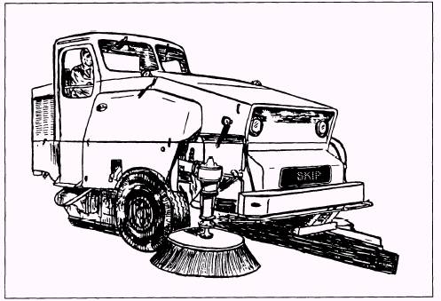 Figure 14-36.-Street sweeper. (fig. 14-37) is one of many different makes and models of self-propelled magnetic sweepers used by the Seabees. This type of sweeper is most effective in warehouse and storage areas and on granular or earth surfaces that cannot be cleaned with broom equipment. Under normal conditions, using the magnetic sweeper around work areas one or two times a week will keep areas free of metal debris. If construction or demolition is in progress, the magnetic sweeper should be used as often as needed to keep areas free of metal debris. Using the magnetic sweeper helps prevent flat tires on wheeled equipment. By positioning the hydraulically controlled lever, the operator can adjust the height of the magnet for the type of surface being swept. Heavy springs and a bumper, mounted on the front of the magnet, help prevent magnet damage when an obstruction is encountered during operation. The springs act to lift the magnet over obstructions and return the magnet to its previous position. After sweeping an area be sure to take the magnetic sweeper to an assigned trash area, dump the debris collected by shutting off the magnetic circuit breaker, and place the debris in the container provided. When refueling a magnetic street sweeper, make sure the engine is shut off, and see that metal-to-metal contact is maintained with the fuel tank and fuel nozzle. Perform the following when operating the magnetic sweeper: . Allow no riders. . Stop operations when adjusting, cleaning, and lubricating the unit. . Do not drop material from the magnet and then run the sweeper over the material. Pick up the material and dispose of it before securing the sweeper. SNOW REMOVAL EQUIPMENT Snow and ice removal operations are affected by many factors. Examples are as follows: availability of suitable equipment, skill and experience of personnel, mission of the activity, geographical location, and type and severity of the weather. An efficient snow and ice removal operation must have competent direction and supervision; however, the final operation depends largely upon the skill, experience, and training of the operators. Snow removal equipment comes in a variety of shapes, sizes, and types. The equipment can range from common push plows (sometimes called displacement plows), graders, loaders, and sand spreaders to sophisticated blower types of equipment.