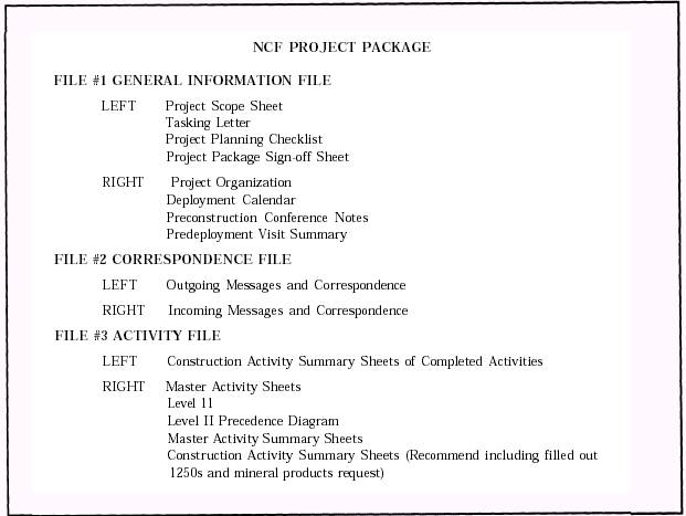 Figure 15-1.-NCF project package outline-Continued. A flow chart, showing the sequence of planning steps, is shown in figure 15-2. These steps are also listed in the project planning milestones list (fig. 15-3). This list is normally assigned by the operations department at the beginning of home port. Step-by-step information on how a project package is developed is outlined in the Naval Mobile Construction Battalion Crewleader's Handbook, COM-SECOND/COMTHIRDNCBINST 5200.2X. |