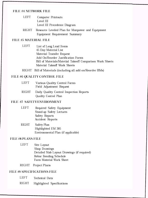 CHAPTER 15 EARTHWORK OPERATIONS A solid foundation must be prepared to support roads, runways, buildings, and other temporary or permanent structures. To accomplish this task, the Naval Construction Force (NCF) must perform earthwork operations, often referred to as horizontal construction. Earthwork operations include much more than just moving the earth. As an EO, you must be able to use the techniques required to achieve the finished product. You accomplish this by planning and developing the steps to complete the project, studying and understanding project drawings, computing earthwork volumes, reading and using construction grade stakes, transferring elevations with leveling equipment, and understanding the characteristics of soils and the procedures used in earthwork operations. PROJECT PLANNING In the NCF, the entire history of each construction project, from the initial planning phase, through the execution phase, to the closeout phase, is documented in a standard nine-folder project package (fig. 15-1). This format is used on all tasked projects.