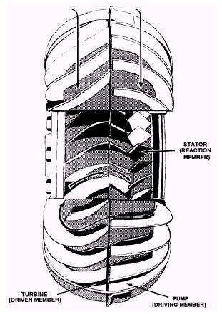 Torque Converter The torque converter is a form of and has replaced the fluid coupling. Most automatic transmissions used in automotive and construction equipment have torque converters. The torque converter consists of three parts: the pump (driving member), the turbine (driven member), and the stator (reaction member), all with curved vanes. The stator is located between the load and the power source to act as a fulcrum and is secured to the torque converter housing. Figure 2-8 shows a cutaway view of a torque converter and the directional flow of oil. The pump throws out oil in the same direction in which the pump is turning. As the oil strikes the turbine blade, it forces the turbine to rotate, and the oil is directed toward the center of the turbine. Then the oil leaves the turbine and moves in a direction opposite to that of the pump. As the oil strikes the stator, it is redirected to flow in the same direction as the pump to add its force to that of the pump. Torque is multiplied by the velocity and direction given to the oil by the pump, plus the velocity and direction of the oil entering the pump from the stator. Planetary Gears Automatic transmissions use a system of planetary gears to enable the torque from the torque converter to be used efficiently.