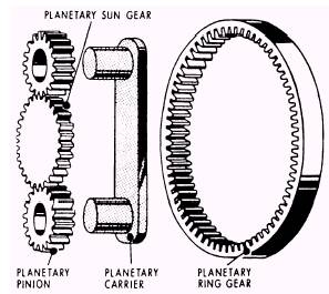 Figure 2-8.-Torque converter. Planetary units are the heart of the automatic transmission. The four parts that make up the planetary gear system are as follows: the sun gear, the ring (or internal) gear, the planet pinions, and the planet carrier. The sun gear is the center of the system. The term planet fits these pinions and gears, because they rotate around the sun gear, as shown in figure 2-9. The ring gear, or internal gear, is so-called because of its shape and internal teeth. An advantage of the planetary gear system is that it is compact. Additionally, in the planetary system more teeth make contact to carry the load. The reason for this is that each gear of the planetary system usually meshes with at least two other gears. Because the gears are always in mesh, none of the teeth are damaged as a result of teeth clashing or a partial mesh. However, the major advantage of the planetary system is the ease of shifting gears. Planetary gears, set in automatic transmissions, are shifted without any special skill required by the operator.