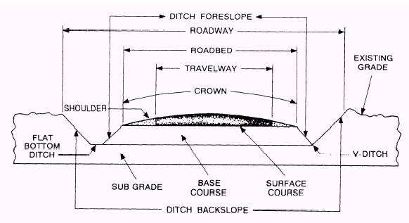 project, including the ditches, is known as the roadway. The roadbed is the section that includes the surface course and both shoulders, and the travel way is the surface course that the vehicle travels on. |