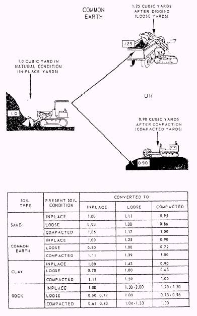 Earthwork computations are the calculations of earthwork volumes or quantities to determine final grades, to balance cut and fill, and to PLAN the most economical movement of material. Volume Changes Most earthmoving is computed in cubic yards; however, on some project drawings, the metric system is used. A cubic yard is a cube 3 feet long, 3 feet wide, and 3 feet high. Many dimensions in field measurements and contract plans are in feet, so if they are multiplied together to obtain bulk (length x width x depth), the results are in cubic feet. To obtain cubic yards from cubic feet, divide the cubic feet by 27 (there are 27 cubic feet in one cubic yard). It is also possible to divide the original linear measurement by 3 to convert the numbers to into yards, and then multiply. However, this may lead to working in fractions, decimals, and mixed numbers. Cubic yards of material are either in place, loose, or compacted. Material, excavated from its natural state, increases in volume, commonly known as swell. Undisturbed material is measured as in-place cubic yards, material loosen by handling is measured in loose cubic yards, and the volume of compacted material is measured as compacted cubic yards. NOTE: When calculating estimates from project drawings, you estimate cuts as in-place cubic yards and estimate fills as compacted cubic yards. To calculate the correct amount of material to be handled, you convert the present soil conditions by using table 15-1. Road Nomenclature A cross-sectional view of a road and its components is shown in figure 15-14. Before any construction is performed on a project site, the elevation is known as existing grade. The driving