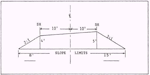 Figure 15-15.-Slope ratio. A cross-sectional view (fig. 15-16) that is given for a road project is a cutaway end view of a proposed station between the left slope and the right slope. Typical cross sections are plotted at any intermediate place where there is a distance change in slope along the center line where the natural ground profile and grade line correspond. The cross section displays the slope limits, the slope ratio, and the horizontal distance between centerline stakes and shoulder stakes. It also shows the vertical distance of the proposed cut or fill at the shoulder and centerline stakes. To compute the area of a cross section, you must first break it down into geometric figures (squares, triangles, etc.). (See fig. 15-17.) Compute each area separately, then total the results to obtain the total square feet.