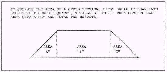 The next step is to compute the total area in the cross section (fig. 15-21). This is accomplished by adding the results of each geometric figure in the cross