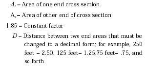 To compute the equation, take the area of one end section (cross section) plus the area of the other end and multiply the sum of the two areas by a constant factor of 1.85. This value should now be multiplied by the distance between the two end areas to determine the number of cubic yards. (See fig. 15-21.) |