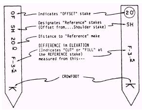 Figure 15-31.-Reference information found on a offset stake. work needed to complete the job is determined by using the information on these stakes. Since this information has to be used often during construction and the original stakes can be destroyed or covered up by carelessness or inexperienced operators, it is necessary to document this information. To prevent the loss of reference information, you should transfer the required information from the stake located in the immediate area of construction to a new stake. Set this stake far enough away so that it will not be damaged or destroyed by equipment being operated in the construction area. This new stake is called an offset stake and is identified by the symbol OF or an O (fig. 15-31). You should note the number of linear feet that separates the offset stake from the original reference stake. This is written on the offset stake below the OF or within the circle, followed by the amount of cut or fill, in feet, which may be required. A stake marked means that the stake is offset 35 feet from the centerline stake and that a cut of 1 foot is required to attain the desired final grade. The difference in elevation must be noted on the offset stake. The symbol, representing the stake from which the information was originally transferred, is also noted on the offset stake. If the offset stake was offset from a shoulder stake, the symbol would be SH instead of ~. The amount of cut or fill, if any, must be noted on the offset stake. However, because of existing terrain, this information on the offset stake may not be the same as that on the original stake. In figure 15-32, you can see that the offset stake reads for a cut to be made to reach a desired elevation at the center line, while a