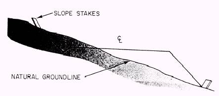 Figure 15-34.-Slope stake set in existing natural groundline. LEVELING EQUIPMENT To set, use, and compute grade stake measurements, you must be able to measure the vertical distance from one point to another. This process is called leveling and is accomplished by using leveling equipment. A level is an instrument used for measuring vertical distances. All levels have a line of sight with a bubble device for maintaining the instrument in a horizontal plane. Levels vary in their accuracy