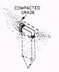 Finish Grade Stakes When performing final grading, you are likely to work with stakes called blue tops. These are hub stakes, which are usually 2 inches by 2 inches by 6 inches. These hubs are driven into the ground until the top is at the exact elevation of the finished grade as determined by the surveying crew. They are colored with a blue lumber crayon (keel) to identify them as finish grade stakes. Red crayon is normally used to indicate the subgrade elevation. Blue top stakes are placed when the existing grade is within 0.2 feet (2.4 inches) above the final or desired grade. The desired grade is obtained by lowering or raising the compacted grade with a grader until it is flush or even with the top of the hub (fig. 15-36).