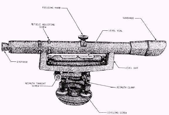 Figure 15-39.-Dumpy level. length. This stick is known as Jacob's staff, as shown in figure 15-38. For rough work, you may ignore the use of a stick and merely use the height of your eye above the ground in your normal standing position. The hand level is used for checking grade during the rough or early part of a construction project and is not used at distances greater than about 50 feet or even lesser distances if an accuracy of more than 2 or 3 tenths is required. |