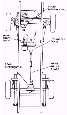 AUXILIARY TRANSMISSION Auxiliary transmissions are mounted on the rear of the regular transmission to provide more gear ratios. Most auxiliary transmissions have only a L-low and a H-high (direct) range in a transfer assembly. The low range provides an extremely low gear ratio for hard pulls. At all other times, the high range should be used. Gears are shifted by a separate gearshift lever in the driver's cab (fig. 2-10). Transfer Cases Transfer cases are placed in the power trains of vehicles driven by all wheels (fig. 2-11). Their purpose is to provide the necessary offsets for additional propeller-shaft connections to drive the wheels. Transfer cases in heavier vehicles have two-speed positions and a declutching device for disconnecting the front driving wheels. Two-speed transfer cases also serve as auxiliary transmissions. Transfer cases are quite complicated. When they have speed-changing gears, declutching devices, and attachments for three or more propeller shafts, they are even larger than the main transmission. Some transfer cases have an overrunning sprag unit (or units) on the front output shaft. A sprag unit is a form of a overrunning clutch; power can be transmitted through it in one direction but not in the other. During normal operation, when both front and rear wheels turn at the same speed, only the rear wheels drive the vehicle.