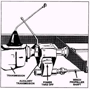 Figure 2-10.-Auxiliary transmission. drive truck. However, if the rear wheels should lose traction and begin to slip, they tend to turn faster than the front wheels. When this occurs, the sprag unit automatically engages. This action allows the front wheels to also drive the vehicle. The sprag unit simply provides an automatic means of engaging the front wheels in drive for more traction. Power Takeoffs Power takeoffs, commonly known as the PTO, are attachments in the power train for power to drive auxiliary accessories. They are attached to the transmission, auxiliary transmission, or transfer case. A common type of PTO is the single-gear, single-speed type that is bolted to an opening provided in the side of the transmission case, as shown in figure 2-10. The sliding gear of the PTO meshes with the transmission countershaft gear. The operator can move a shifter shaft control lever to slide the gear in and out of mesh with the countershaft gear. The spring-loaded ball holds the shifter shaft in position. On some vehicles, PTO units have gear arrangements that give two speeds forward and one in reverse. Several forward speeds and reverse gear arrangements are usually provided in PTO units used to operate winches and hoists. |