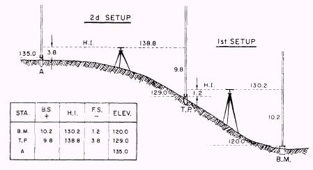 TURNING POINT.- The two missing grade stake examples were based on elevations of nearby points that could be read from one setup of the level. If differences of elevation or distance are too great or if there are obstructions, you will have to make an intermediate setup and sight on a point, called a turning point (T.P.). Any convenient point may be used as a turning point, but the level rod must be set on firm ground or on some firm object so that the elevation of the T.P. will not change while the rodman waits for the levelman to setup at the new position. An example of a level run is shown in figure 15-54. You have a B.M. at the bottom of a bank and you want to find the elevation at the top of the bank, which is point A. You cannot set up on the top of the bank to take a reading on the level rod held on point A because to take a backsight shot on the B.M., the level rod is too short. First, record the B.M. elevation of 120.0 feet. Next, set up the level instrument on the bank and take a backsight shot on the B.M. to get a level rod reading of 10.2 feet. Add the backsight shot of 10.2 feet to the B.M. elevation of 120.0 feet to get the first instrument height of 130.2 feet. Then take a foresight shot on the T.P. to get a level rod reading of 1.2 feet. Subtract the 1.2 feet foresight reading from the 130.2 feet instrument height to get a T. P. elevation of 129.0 feet. Next, move the instrument to the top of the bank. Take a backsight shot on the T.P. to get a level rod reading of 9.8 feet. Add the 9.8 feet backsight reading to the 129.0 feet T.P. elevation to get a second instrument height of 138.8 feet. The last step is to take a foresight shot on point A to get a level rod reading of 3.8 feet. Subtract the 3.8 feet foresight reading from the 138.8 feet second instrument height to get a 135.0 feet point A elevation. Some level runs may require more than one T. P.; however, no matter how extensive the job, the procedure is always the same: you add and subtract successive rod readings from a point of known elevation to the point of unknown elevation. MEASURING HORIZONTAL DISTANCES Setting or replacing grade stakes requires measuring horizontal distances with either a woven tape or a steel tape.