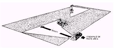STRIPPING Stripping consists of removing and disposing of objectionable topsoil and sod. It may either follow or be done with clearing and grubbing. Actual earthmoving begins with stripping; surface soil and rocks are removed from the area to be excavated. Deeply embedded rocks and large boulders may have to be blasted before they can be removed. The material removed by stripping is called spoil. Unless otherwise directed, you should dump spoil along the area to be excavated within range of the earthmoving equipment. If the spoil will not be put to use, such as turfing or finishing the shoulder of a road or runway, it should be wasted along the edges of the project, as shown in figure 15-64. Take care not to disturb necessary drainage. Equipment, commonly used in stripping, consists of a dozer, a scraper, and a grader. As mentioned earlier, the dozer is the most often used when removing trees. Dozers can handle all short-haul excavations (up to 300 feet). For long-haul excavations (over 300 feet), scrapers should be used. A scraper may be used also on fine soils for shallow stripping. A grader is used mainly for shaping and finishing a stripped surface. It is adaptable also for ditching, for sidecasting, and for sloping banks. DRAINAGE Drainage is the construction of facilities needed to allow excess surface and subsurface water to flow from the construction site. Properly designed and constructed drainage systems are one of the most important parts of a construction project. Without proper drainage, rainwater and water running off the surrounding ground could turn the area into a lake. It is also necessary to drain off surface water that would soak down and wet the subgrade. The elements, determining drainage needs for a road or project site, are the amount of annual rainfall in the area and the routes or areas that can be used to collect or channel excess surface and subsurface water, such as lakes, ponds, streams, or voids (i.e., gullies). The type of soil is critical to the design and construction of a road. It is poor judgment to construct a road over or through clay, sand, or other undesirable material if it cannot be properly compacted. It is best to bypass this type of material. If a road surface is to endure continued use for years, it must have firm support from the subgrade. All organic materials, such as living or decayed vegetation, should be removed from the area of the subgrade unless the road is for emergencies or is temporary (detour or military road). In designing and building a road, consider the type of drainage, the type of soil, and the amount of clearing or grubbing necessary. To facilitate drainage, excavate diversion ditches to conduct all surface water into natural channels or outfall ditches. Outfall ditches are constructed to drain low or boggy spots. At the point or the end of the system when the accumulated runoff discharges into the disposal point, the runoff is technically known as discharge. The discharge point in the system is called the outfall. This preliminary work is done at the same time the area is cleared and grubbed. The finished drainage system usually consists of ground slopes, ditches, culverts, gutters, storm drains, and underground water drains. Open channels should
