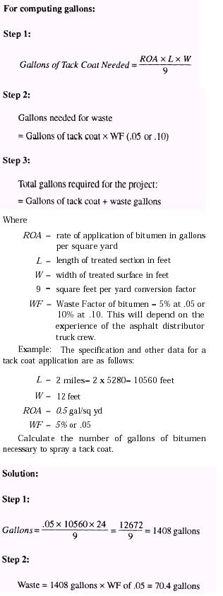 Tack Coat A tack coat is an application of asphalt to an existing paved surface to provide bond between the existing surface and the asphalt material to be placed on it. Two essential requirements of a tack coat areas follows: (1) it must be thin and (2) it must uniformly cover the entire surface to be treated. A thin tack coat does no harm to the pavement, and it will properly bond the course. Some of the bituminous materials, used for tack coats, are rapid-curing cutbacks, road tar cutbacks, rapid-setting emulsions (may be used in warm weather), and medium-asphalt cements. Because rapid-curing cutbacks are highly flammable, safety precautions must be carefully followed. A tack coat should be applied only when the surface to be tacked is dry; and the atmospheric temperature has not been below 35F for 12 hours immediately before application. Before applying the tack coat to a surface that is sufficiently bonded, ensure that all loose material, dirt, clay, or other objectionable materials are removed from the surface to be treated. This operation may be accomplished with a power broom or blower, supplemented with hand brooms if necessary. Immediately following the preparation of the surface, the bituminous material should be uniformly applied by means of a bituminous (asphalt) distributor at the spraying temperature specified. The amount of bitumen application, known as rate of application (ROA), for a tack coat should be applied in quantities not less than 0.05 or more than 0.25 gallon per square yard. The exact quantity varies with the condition of the existing pavement being tack-coated. Normally, the construction project specification denotes the ROA for the tack coat application; however, when the ROA is not included in the project specifications, the NCF uses an ROA of .15 for planning and estimating purposes. Following the application of bituminous material, the surface should be allowed to dry until it is in a proper condition of tackiness to receive the surface course; otherwise, the volatile substances may act as a lubricant and prevent bonding with the wearing surface. Clean, dry sand should be spread on all areas that show an excess of bitumen to blot up and cure the excess effectively. After excess bitumen is set, any loose sand should be lightly broomed from the primed surface before the wearing surface is laid. An existing surface that is to be covered by a bituminous wearing surface should be barricaded to prevent traffic from carrying dust or mud onto the surface, either before or after the tack coat is applied. Should it become necessary for traffic to use the surface, one lane may be tack-coated and paved, using the other lane as a traffic bypass. The bypass lane should be primed and sanded before it is opened to traffic and it should be swept and reprimed after the adjacent lane is completed. Doing this preserves the base and acts as a dust palliative (shelter.) The formula for a tack coat estimate is as follows: tack coat application are as follows: