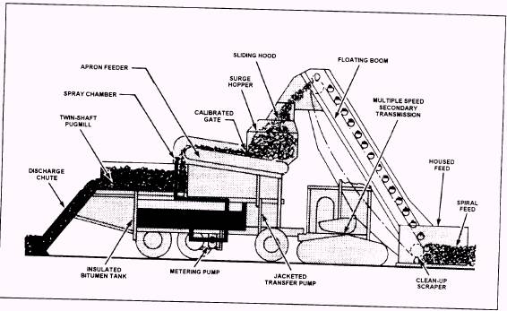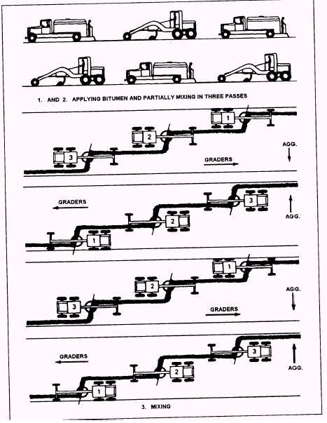 ROAD-MIXING METHODS Two methods of road mixing are travel plant mixing and blade mixing. Travel Plant Mixing When a travel plant is used for mixing (fig. 16-7), the loose aggregate is dumped, mixed, and bladed into uniform windrows, and evened when necessary. The windrow should be sufficient to cover the section of the area to be paved with enough loose material to give the desired compacted depth and width. As the bucket loader tows the mixer and elevates the aggregate to the mixer hopper, the mixer meters the aggregate, sprays it with the correct amount of bitumen, mixes these two uniformly, and redeposits the mix into another windrow behind the plant. The rate of travel and the mixing operation should be controlled so that all particles of the aggregate are coated and the mix is uniform. Accuracy in proportioning the mix is extremely important. The travel plant method usually produces a more uniform mix of higher quality than blade mixing.