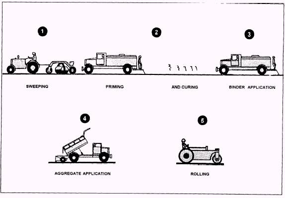 Figure 16-28.-Sequence of operations for the application of a single-surface treatment. cover the surface uniformly. After the binder cools and cures, it should bind the aggregate tightly to prevent dislodgement by traffic. Individual aggregate stones should be pressed into the binder but must not be covered by the binder. Approximately one half of the individual aggregate stones should be exposed to traffic. The ROA for the binder material should be between 0.25 and 0.30 gallon of aspalt per square yard. For a single-surface treatment, the bitumen must be heated and applied to the surface while hot. The aggregate must be spread and rolled before the bitumen cools. Under no circumstances is traffic permitted to travel upon uncovered fresh bitumen. The distributor should NOT apply bitumen until the aggregate is on hand and ready for application. When the distributor moves forward to spray the asphalt, the aggregate spreader should start right behind it. The bitumen should be covered within 1 minute if possible; otherwise, the increase in asphalt viscosity may prevent good binding of aggregate. Aggregate Application.- The size and amount of aggregate, used for surface treatments, are important. You must use a size that matches the bitumen application rate. For a single-surface treatment, one-half inch to sieve number 4 is needed. The amount of aggregate should be 25-30 pounds per square yard. When aggregate is distributed properly, very little hand work is required. At longitudinal joints, the aggregate cover is stopped 8 inches from the edge of the bitumen to ensure ample overlap of the bitumen coat. All bare spots should be covered by hand spreading, and any irregularities of the distribution should be corrected with hand brooms. Excess aggregate in limited areas should be removed immediately with square-pointed shovels. When the aggregate spreader is properly set and operated, handwork is reduced to a minimum. Rolling.- The aggregate is usually rolled by pneumatic-tired rollers. Steel-wheeled rollers are not recommended by themselves. If used, they should make only one pass (one trip in each direction). The rolling operation should then be completed with the pneumatic-tired rolls. Steel-wheeled rollers produce maximum compaction but must be used with care to prevent excessive crushing of the aggregate particles. Also, these rollers will bridge over smaller size particles and small depressions in the surface and will fail to press the aggregate in these places in the asphalt. Faulty rolling can be eliminated or minimized if you adhere to the following procedures: 1. Rolling should be parallel to the center line of the roadway to reduce the number of times the roller must change direction. 2. Succeeding passes should overlap one half of the wheel width of the roller. This action ensures that the aggregate becomes well embedded in the bitumen. 3. Rolling should be completed before the bitumen hardens. This will ensure that the aggregate becomes well embedded in the bitumen. 4. Succeeding passes should be made from the low side to the high side of the surface. This operation maintains the surface crown and prevents feathering at the edges. 5. Rolling should be done at a slow speed. 6. Rollers should be only wet enough to prevent bitumen from sticking to the wheels. 7. The power wheel of the roller should pass over the unrolled surface before the steering wheel(s) of the rollers. After rolling and curing, the surface is ready for traffic. When the surface is used as an airfield, excess aggregate must be swept from the surface to avoid damage to aircraft. This practice is also recommended for roads. |