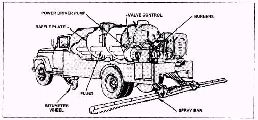 ASPHALT DISTRIBUTOR The asphalt distributor (fig. 16-33) is a unit consisting of an insulated storage and heating tank, an open flame heating system, an asphalt pump, a low-pressure air blower, and a circulating and spraying system. Power to operate the components is PTO driven. NOTE: The operation of this truck requires the absolute need for experienced personnel only. Mishaps, resulting in loss of man-days and equipment, are a direct result of this factor being overlooked. Heating System The air blower provides low-pressure air to atomize fuel for the burners. The burners heat the tubes, located in the tank. An asphalt covering must be maintained over the fire tubes to prevent them from overheating and causing a fire or explosion. Because the distributor is mobile, care must be taken to ensure that heating is performed in a level area that is well-ventilated and that the distributor truck is not moving at all and is at a COMPLETE HALT. Whenever you are heating cutbacks, the asphalt must be circulating at all times. This is a must to prevent any chance of volatile liquids overheating around the flues, which can be very dangerous. Spray System The spray system consists of necessary piping, a series of hand-operated valves to control the flow of bitumen, and an adjustable length spray bar, capable of providing coverage from 4 to 14 feet wide. The spray bar may be the full-circulating or the noncirculating type, depending on the model of the distributor. The spray bar may be equipped with either 1/8-inch nozzles or 3/8-inch nozzles; the 1/8-inch nozzles are used for most applications. The application rate is controlled by the length of the spray bar, the pump output, and the forward speed of the distributor truck. Spray Bar Adjustments For normal use, the spray bar of the distributor should be adjusted, so the vertical axes of the nozzles are perpendicular to the roadway. Also, each nozzle on the spray bar should be set at the same angle. The angle set for each should be between 15 degrees to 30 degrees of the horizontal axis of the spray bar (fig. 16-34) or according to manufacturer's specifications. This action prevents the fan-shaped spray patterns of the nozzles from interfering with each other. Another adjustment that is essential for uniform prime or tack coat coverage is the adjustment of the height of the spray bar. As shown in figure 16-35, the fan-shaped spray patterns from the nozzles overlap to different degrees, depending on the distance between the spray bar and the surface to be covered. The spray bar should be set high enough, usual] y 10 to 12 inches above the roadway for the surface to receive triple