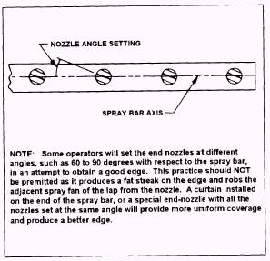 Figure 16-34.-Proper angling of nozzles. coverage. This height varies according to the nozzle spacing of the spray bar. Under heavy wind conditions or depending on the nozzle spacing, it maybe necessary to lower the bar farther down so that the surface only receives double coverage. On some distributors, as asphalt is sprayed (and the load lightens), the truck rear springs of the truck rise, raising the distributor and changing the height of the spray bar. Mechanical devices are usually available that automatically correct the height of the spray bar, as this change occurs. The uniform application of asphalt prime and tack coat is essential. Transverse spread should not be allowed to vary more than 15 percent, and the longitudinal spread should not vary more than 10 percent. To ensure the correct application, you must calibrate the distributor before it is used. Then the transverse and longitudinal spread rate variations should be checked periodically to determine when the distributor is operating within these limits. A procedure for checking these spread variations in the field has been standardized by ASTM D 2995, published by the American Society for Testing and Materials. |