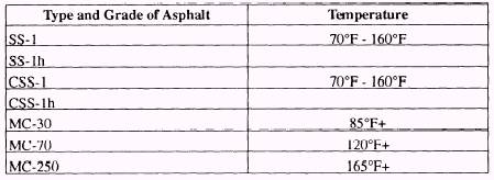 Suggested Spraying Temperatures Suggested spraying temperatures are given in table 16-3 for various types and grades of asphalts commonly used for prime coating and tack coating. WARNING Application temperatures may, in some cases, be above the flash points of some materials. Care must be given to prevent fire or explosion. The maximum temperature (cutback asphalt) shall be below that at which fogging occurs. Below are the formulas used for distributor truck operations. Table 16-3.-Suggested Spraying Temperature Ranges for Prime and Tack Coat