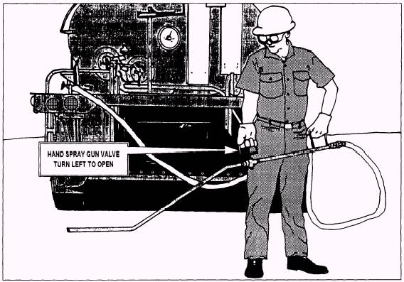 Figure 16-36.-Hand-spray application. To compute truck application speed in feet per minute (FPM):