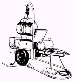 Figure 16-37.-Asphalt kettle. mounted inside. A removable fuel burner, mounted inside the kettle outer shell, provides heat to the melting tank through a baffle. A flue stack located on the forward end of the melting tank over the top of the baffle and burner assembly, provides an escape for exhaust gases. A thermometer, inserted through an insulated pipe into the interior of the melting tank indicates the temperature reading of the bituminous material being heated. When the bituminous material is overheated, a fire or explosion can result. A two-cylinder gasoline engine provides power for the bitumen pumping system. When you shift the clutch shifter lever, the engine is engaged to the pump assembly that provides the pressure for all pumping operations. A flexible, metal spray hose, which connects the pump to the hand-held spray bar assembly, is used to convey bitumen to the surface being repaired. |