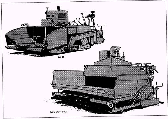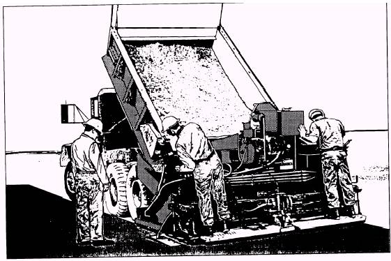 Truck Hitches The purpose of a truck hitch on the front of the paver hopper is to keep the truck dumping hot mix into the hopper in contact with the paver. If, during dumping, the truck and the paver separate and hot mix spills, it must be cleaned up before the paver passes over it. Two types of truck hitches are in common use. One type uses an extension that reaches under the truck and hooks onto the rear axle of the truck. The other type of hitch has retractable rollers that are attached to the truck push bar and grip the outer side of the rear wheels of the truck. The rollers revolve with the wheels while the truck dumps its load into the hopper. Pivoted Truck Push Rollers The pivoted push roller is a device, mounted on the front of the paver, that adjusts when alignment between the truck and paver is uneven. This device reduces the uneven force exerted on the paver by the misaligned truck, minimizing interference in the steering of both vehicles. ASPHALT FINISHERS (PAVERS) Various makes and models of asphalt finishers are used by the Naval Construction Force (NCF). Two types are shown in figure 16-38. Even though the finishers may operate differently, their primary jobs are all the same: receiving asphalt and spreading it in a predetermined, uniform length, width, thickness, and shape. The finisher also provides initial compaction of the mat (layer of mixture in place.) Because asphalt finishers are different, you must always read the operator's manual for the unit you are operating. It is also good to have a practice sand laydown before actually using a hot mix. This is to familiarize yourself and others with the machine and also ensure that the machine is working properly. Figure 16-39 shows a practice laydown, using just the aggregate mix without the asphalt.