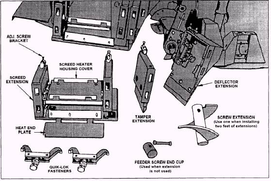 SCREED HEATERS.- The screed is equipped with heaters, used to heat the screed plate at the start of each new paving operation. The heaters are not used to heat the mix during the paving operation. If the screed is not initially heated, the mix will tear and the texture will look open and coarse, as it would if the mix were too cold. There are times when the paver operator allows the mix to heat the screed plate. This practice almost always results in a section of unsatisfactory pavement being laid while the screed is being heated. SCREED ACCESSORIES.- Three types of commonly used screed accessories are screed extensions, cutoff shoes, and bevel end plates. Screed Extensions.- Screed extensions (fig. 16-46) are attachments that widen the screed, allowing the paver to place a wider-than-normal mat. On some