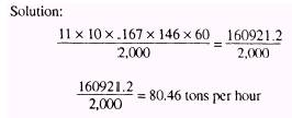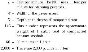 Example: The required tonnage of hot-mix asphalt for a project is 800 tons. The screed of the paver is set at 10 feet, and the depth of asphalt is 2 inches. Estimate the amount of asphalt that can be laid per hour.
