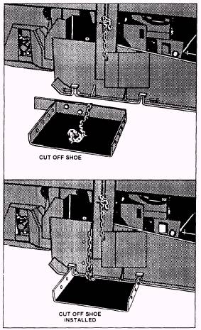 Figure 16-46.-Screed extension accessories. models, screed extensions make it possible to pave widths up to 24 feet in a single pass. Cutoff Shoes. - Cutoff shoes (fig. 16-47) have the opposite function of screed extensions. They are metal plates inserted into the screed to reduce the width of the mat being placed. Bevel End Plates.- Bevel end plates (fig. 16-48) are used to bevel the edge of the mat. On some models, the shoes can be set at any one of three positions: vertical, 30 degrees, or 45 degrees. Tons Per Hour The equation, used to compute the amount of asphalt that can be layed with a paver per hour, is as follows: