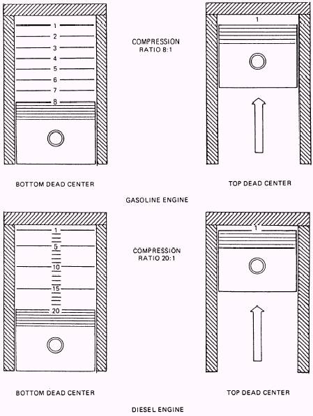 Figure 1-7.-Diesel and gasoline engines compression strokes.