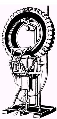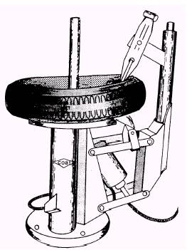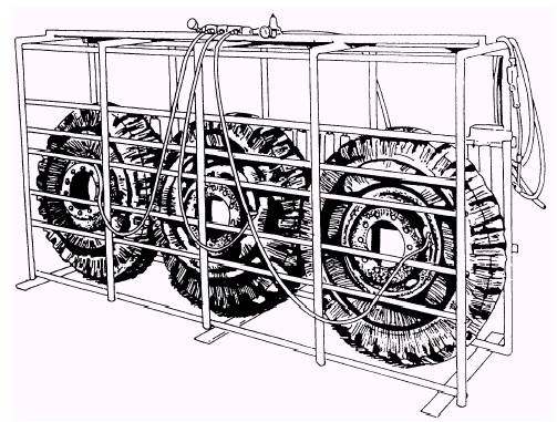 Figure 3-30.-Inflation safety cage. equipment is similar to those shown in figures 3-28 and 3-29. The first step in tire changing is to remove the valve core and deflate the tire completely. When using any tire repair equipment, install the tire and rim by closely following the manufacturer's instructions. The pneumatic tire demounter holds the wheel and tire still while it breaks the tire bead loose from the wheel rim. An adapter is used to remove the tire from or replace it on the rim. Tire demounters are manual, hydraulic, or air-operated. The one shown in figure 3-28 is an air-operated demounter for automotive and light truck tires. NOTE: All of the related instructions for the use of tire shop equipment must be posted in the tire shop. The spreader (fig. 3-29) separates the tire beads enough to allow close inspection and maintenance on the inside of the tire. When mounting a tire, inflate the tube until it is almost round. Put the inside bead of the tire on the rim and insert the tube into the tire with the valve at the balance mark on the tire. Place the valve stem through the hole and make sure that it is perpendicular to the hole. This step prevents chafing and damage to the valve stem during vehicle operation. When installing the second bead on the rim, start on the