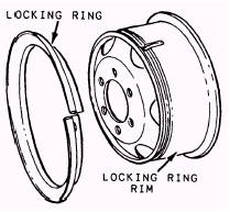 Figure 3-31.-Locking ring rim. have to repair. When repairing tires with locking rings (fig. 3-31), first remove the valve core and deflate the tire. Force the tire bead away from the removable side ring with a slide hammer device intended for this purpose. Next, remove the side ring, as shown in figure 3-32, views A and B. Turn the wheel and tire over and