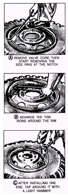 Figure 3-32.-Demounting and mounting a military truck tire. loosen the other bead. Once the beads are broken, the tire can be removed from the rim by standing the tire on the thread and prying the wheel out of the tire. Ensure the valve stem is not bent or damaged as the wheel is removed. To replace the tire, position the wheel, as shown in figure 3-32, view C. Lower the tire over the rim, and at the same time, make sure the valve stem is passed through the valve hole and points upward. NOTE: The valve stem should always point toward the removable side ring. If there is no side ring, point it toward the disc portion of the wheel. The next step is to center the side ring and force one end into position with your foot. Then the ring can be installed as shown, or the repair person can merely walk around the top of the ring and force it to slide into the locking groove. Inflating a tire mounted on a locking ring rim is dangerous. An improperly seated lock ring may blow off, causing serious injury to you or any other person in its path. A sprung ring, or one which is bent or twisted, may be difficult to install and, if used, is a safety hazard and should be replaced. Before applying air pressure to this tire, be sure that the locking ring is seated against the rim of the wheel through its entire circumference. If the lock ring does not seat properly, inflate it to 5 to 10 pounds, then tap the locking ring carefully with a mallet. NEVER STAND IN FRONT OF OR OVER THE LOCKING RING. ADDITIONALLY, REMEMBER TO USE THE SAFETY CAGE FOR INFLATION. When you have to inflate a tire that is already mounted, use a snap-on chuck which is an air hose that snaps onto the valve stem. This allows you to stand to one side of the tire. Make it a professional practice to never stand in front of a tire being inflated.