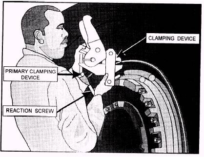 Earthmover Tire Repair When major damage or a blowout occurs or normal wear limits have been reached, the tire must be removed. Size alone makes the removal and replacement of earthmover tires difficult. Additionally, the nature of the terrain over which they operate often cause conditions to be far from ideal. Certain tools are necessary to change these large tires. The hydraulic bead breaker is specifically designed to break the giant beads for easier removal of the tire. BEFORE ATTEMPTING TO REMOVE THE TIRE, MAKE SURE THE WHEEL HAS BEEN JACKED UP AND THE EQUIPMENT PROPERLY BLOCKED FOR MAXIMUM SAFETY. After the equipment has been safely cribbed, deflate the tire completely by removing the valve core. The clamping device is used to aid in unseating (breaking) the tire beads. Attached to the rim flange, it holds the hydraulic ram and shoe assembly. When securing the clamping device (fig. 3-34) to the rim, release the primary clamping device to permit full opening of the jaws. Hold the clamping device in a vertical position, as shown. Then hold the clamping device in place with one hand and tighten the large clamping screw lightly. Swing the reaction screw, as shown, until it is approximately perpendicular to the side of the rim flange. Turn the reaction screw in to bring the clamping device perpendicular to the rim. Tighten