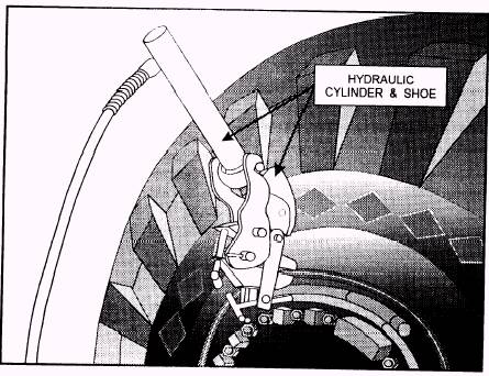 Figure 3-36.-Operation of hydraulic cylinder and shoe. 1. Buff or roughen the tube surface to be patched for at least 1 inch around the hole. Then clean it with solvent. When a buffer is not available, use the perforated cover of the kit as a scraper. 2. Apply a thin coat of rubber patching cement evenly over the roughened surface and allow it to dry. 3. From the kit, choose a patch of the proper size that is about 3/4 inch larger than the hole in the tube from the kit. Remove the protective covering from the sticky side of the patch; place the patch over the hole, and rub it down firmly. 4. Inflate the tube with enough air to check for leaks. If you cannot hear or feel air escaping from the patch, you can make another check by inserting the patched area in water. If no escaping air bubbles are noticed, the tube may be dried and replaced in the tire or stored. Hot Patches Hot patches consist of a slow burning block of fuel held in a notched metal pan on the bottom of which is a patch of uncured rubber. To apply a hot patch, follow the manufacturer's instructions on the kit. Although methods of applying patches vary with the clamping devices provided and the shape of the patch, you clean and roughen the tube just as you did in applying the cold patch. When the patching unit is placed in the notches of the patch and clamped to the tube, the burning material is ignited, allowed to burn, and then removed after cooling for at least 5 minutes. After this, examine the completed patch to see if the edges of the patching material are attached securely to the tube. Then install the valve core and test the tube. Hot patches of assorted sizes are supplied in kits similar to the cold patch kits. You will also find pressure clamps and roughening tools in the hot patch kits. |