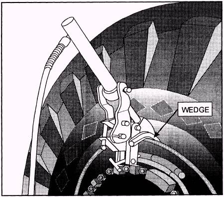 Figure 3-35.-Hydraulic cylinder and shoe. the primary clamping screw firmly by hand. When the clamping device is secured in place, turn the handle on the bottom of the reaction screw. This handle swivels up and down to permit maximum movement of the clamping device side arms to ease hooking the ram cylinder into place. The hydraulic cylinder and shoe assembly (fig. 3-35) are actuated by a pump. The pump applies hydraulic pressure that forces the ram with the attached shoe down between the rim flange and tire bead. This action separates the tire bead and rim. When securing the ram to the clamping device, place the ram and shoe assembly between the arms of the clamping device where the bracket of the cylinder is secured into the notches of the clamping device side arms, as shown in figure 3-35. Applying pressure to the hydraulic cylinder forces the shoe down over the clamping device, as shown in figure 3-35. The jaws of the clamping device acts as a guide for the shoe. The convex side of the shoe bears against the sidewall of the tire, forcing it inward between the tire bead and rim flange, thus breaking loose the bead from the rim. Figure 3-36 shows how the wedges are placed on each side of the shoe assembly to hold the bead of the tire away from the rim flange so that the shoe assembly can be easily removed. After the shoe has been forced between the tire bead and rim flange and freed from that portion of the tire bead, the wedges are inserted to keep the tire bead separated from the rim. Pressure is then removed from the hydraulic cylinder slowly. The hydraulic cylinder and clamping device are then removed from the rim and the clamping device is placed approximately 90 degrees from the wedge. This process is continued until the tire bead is completely free from the rim flange. Cold Patches Cold patches are used to repair punctures and small breaks or holes in tubes. The procedure for applying a cold patch is accomplished by the following steps:
