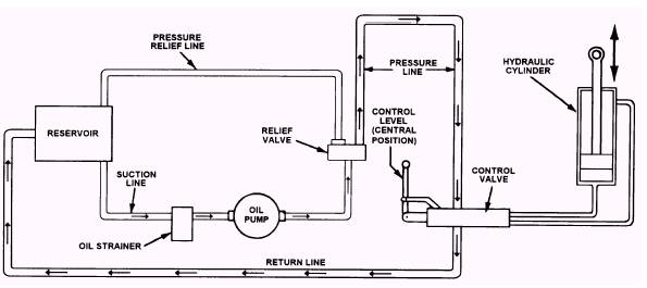 Hydraulic Pressure Gauge Most types of construction equipment are equipped with hydraulic pressure guages. When operating this equipment, you must watch for leaks. Consult the operator's manual for the pressure at which the equipment should be operated. Should the pressure not reach the operating range or should you detect a leak, be sure to document and report either or both. Hydraulic Temperature Gauge Most types of construction equipment are also equipped with hydraulic temperature gauges. In most cases, if the hydraulic temperature exceeds the recommended temperature, it is because the fluid level is 100 low. Should the fluid level be correct and the equipment overheats, you are overworking the hydraulic system. Stop your machine and check the hydraulic fluid level. Be careful because the hydraulic fluid is hot and the hydraulic system may be pressurized. If the fluid level is normal, let the machine sit at idle to cool the hydraulics. Fuel Level Gauge When prestart inspecting a piece of equipment, you should visually check the fuel. During the day, watch the fuel gauge to ensure it shows a slow depletion of fuel. Should the fuel gauge not move in a reasonable amount of time, assume the fuel gauge is broken. In this case, check the fuel visually from time to time to ensure that you do not run out of fuel. HYDRAULIC SYSTEMS Hydraulic systems on equipment are used to transmit power for steering and controlling the operation of mechanical components. The basic components of a hydraulic system (fig. 4-9) consist of a reservoir, strainer and falters, pump, control valves, hydraulic cylinders, hoses, couplers, accumulators, and on some systems, a hydraulic motor. The hydraulic reservoir is the fluid storehouse for the hydraulic system. It contains enough fluid to supply the normal operating needs of the hydraulic system and an additional supply to replace fluid lost through minor leaks. Additionally, the reservoir allows the settling of any impurities and separation of air from the fluid before reuse in the system. The basic hydraulic reservoir (fig. 4-10) has a space above the fluid even when they are full. This space allows the fluid to foam, and thus purge itself of air