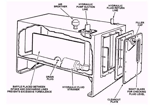Figure 4-10.-Basic hydraulic reservoir. bubbles that normally occur as the fluid flows from the reservoir, through the system, and back to the reservoir. The air vent allows the air to be drawn in and pushed out of the reservoir by the ever-changing fluid level. An air filter is attached to the air vent to prevent drawing atmospheric dust into the system. Because it is essential that the fluid in the reservoir be kept at the correct level at all times, the sight gauge is provided to allow the normal fluid level to always be seen The baffle plate segregates the outlet fluid from the inlet. This allows the fluid time to dissipate air bubbles, contaminants to settle, and the return fluid to cool before it is picked up by the pump. The proper hydraulic fluid level must be maintained. In some systems low fluid level causes overheating because the fluid does not have enough time to cool in the reservoir before it gas back into the pump. Also, some systems will not work at all because the fluid is so low in the reservoir that air gets into the pump. Before adding hydraulic fluid, know what type to use and make sure it is clean. Clean around the filler cap or tube so there is less chance that dirt can get into the system. STRAINERS AND FILTERS Hydraulic systems have a strainer and one or more filters that remove the impurities that would eventually contaminate the hydraulic fluid. The strainer is normally located in the reservoir or in the inlet line to the pump. The filter is normally located so only a small amount of fluid is lost when the element is changed. The falter is equipped with a valve that allows the fluid to bypass the filter element should it become clogged. The falter element is usually of the paper cartridge, canister, or edge type and is similar to those used in engine lubrication systems. Regular filter maintenance, performed by the mechanics, is necessary to prevent contaminated fluid from being recirculated in the system. |