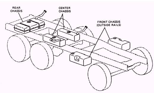 Figure 1-16.-Common fuel tank locations. bum. The engine is fitted with a valve train to operate the valves, as shown in figure 1-15. The camshaft is made to rotate with the crankshaft through the timing gears. The cam lobe is the raised portion on the camshaft that contacts the bottom of the lifter. As the cam rotates, the lobe pushes up on the lifter. The cam lobe pushes the valve open against the pressure of a spring. As the cam lobe rotates away from the lifter, the valve spring pulls the valve closed. The proper positioning of the cam lobes on the camshaft establishes a sequence for the intake and exhaust valves. |