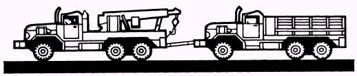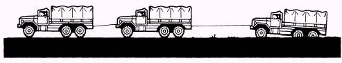 SELF- AND LIKE-VEHICLE RECOVERY A winch-equipped mired vehicle can perform self-recovery. Attach the snatch block to a suitable anchor and the free end of the cable to a chain sling connected to both of the front lifting shackles of the mired vehicle. A fixed block provides a mechanical advantage on a self-winching operation, even though the sheave of the block is performing as a first-class lever. (See fig. 5-12.) Use a similar wheeled vehicle as the source of effort to perform recovery by towing and winching. For vehicles not equipped with lifting shackles, attach a tow chain to the main structural members. Before towing or recovering a disabled vehicle, check the vehicle operator's manual to ensure that all physical and safety features are considered. This must be done to prevent additional damage to the disabled vehicle. To recover a mired truck by towing with a similar vehicle, use a tow chain or a wire rope sling between the towing vehicle and the mired vehicle. Attach it to one lifting shackle of the mired vehicle and through the tow pintle on the towing vehicle. Apply power slowly to prevent shock to the towing device and lifting shackles. If one towing vehicle cannot attain sufficient towing effort to overcome the resistance, use another towing vehicle in tandem with the first, as shown in figure 5-13.