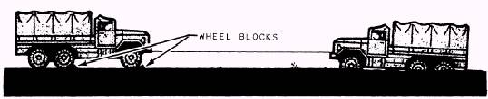 Figure 5-14.-Winching with a like-vehicle. To winch a mired truck, use a truck with a winch of equal or greater capacity to perform the recovery. Often, the winching or recovery vehicle must be anchored by more than its own weight. Place wheel blocks, chocks, or natural material in front of the front wheels of the recovery vehicle. (See fig. 5-14.) For more information on vehicle recovery, refer to Vehicle Recovery Operations, FM 22-20. INTERNATIONAL SIGNALS AND ROAD SIGNS The international system used for traffic control devices emphasizes pictures and symbols, rather than written messages. Symbols have several advantages over word messages, such as the following: (1) they provide almost instant communication with the driver, because they can be understood at a glance without having to be read; and (2) they overcome language barriers which is important because of the growth of international travel. Familiarity with the symbolic signs can help Americans traveling abroad as well as foreigners visiting the United States. As the new signs are introduced, companion word messages will also be used until the public becomes accustomed to the new system. Figure 5-15 shows several traffic signs and markings that are used on U.S. roadways. Additional international signals and road signs are illustrated in appendix II. The color and shape of these signs are important. COLORS Red indicates a stop or a prohibition. Green shows movement permitted or gives directional guidance. Blue is for signs leading to motorist services. Yellow indicates a general warning. Black on white indicates regulatory signs, such as those for speed limits. Orange conveys construction and maintenance warnings. Brown is for public recreation and scenic guidance. SHAPES Diamond-shaped signs signify a warning. Rectangular signs with the longer dimension vertical contain a traffic regulation. Rectangular signs with the longer dimension horizontal contain guidance information. An octagon means stop; an inverted triangle means yield. A pennant means no passing; a pentagon shows the presence of a school. A circle warns of a railroad crossing. PAVEMENT MARKINGS Road markings on highways are yellow and white; however, each has a different meaning. White lines separate lanes of traffic going in the same direction. Yellow markings separate lanes of traffic traveling in different directions. Solid yellow lines indicate there should be no passing from either direction. Broken yellow lines indicate that you can pass with caution. Remember: You are traveling on a highway with traffic going in both directions. Solid white lines indicate there should be no lane changing. They are used at stoplights, turning lanes, and intersections on highways. Broken white lines indicate that cautious lane changes may be made.