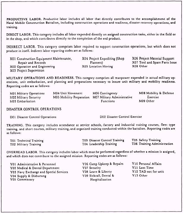 Figure 6-24.-Subcategories of labor. weighing and marking station. Weighing and marking procedures are outlined in the Equipment Operator, Advanced, NAVEDTRA 12537. Cargo that is to be loaded on an aircraft is palletized on 463-L air certified pallets, as shown in figure 6-25. The weight of an empty 463-L pallet is standardized at 290 pounds; when side and top nets are added the pallet weight is 355 pounds. These figures are to be used in weight and balance planning of an aircraft load plan. The outside dimensions of a 463-L pallet are 88 inches long and 108 inches wide. The usable space on the pallet is 84 by 104 inches; this leaves a 9-inch space around